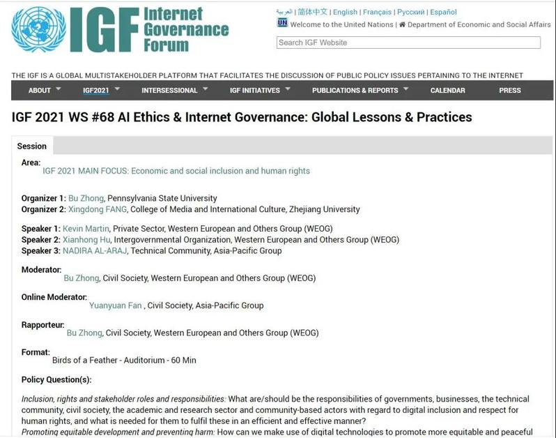 Prof. Fang Xingdong of the College of Media and International Culture (CMIC) and Prof. Zhong Bu of the Pennsylvania State University jointly led the application for the AI Ethics & Internet Governance: Global Lessons & Practices Seminar. The seminar will be held on December 10, 2021 and is one of the 83 seminars on the schedule of the 2021 IGF Annual Meeting.